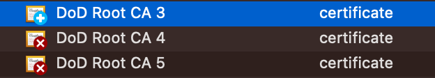 You need to manually trust the DoD Root CA 3, 4, 5, & 6 certificates Double click each of the DoD Root CA certificates, select the triangle next to Trust, in the When using this certificate: select Always Trust, repeat until all 3 do not have the red circle with a white X.